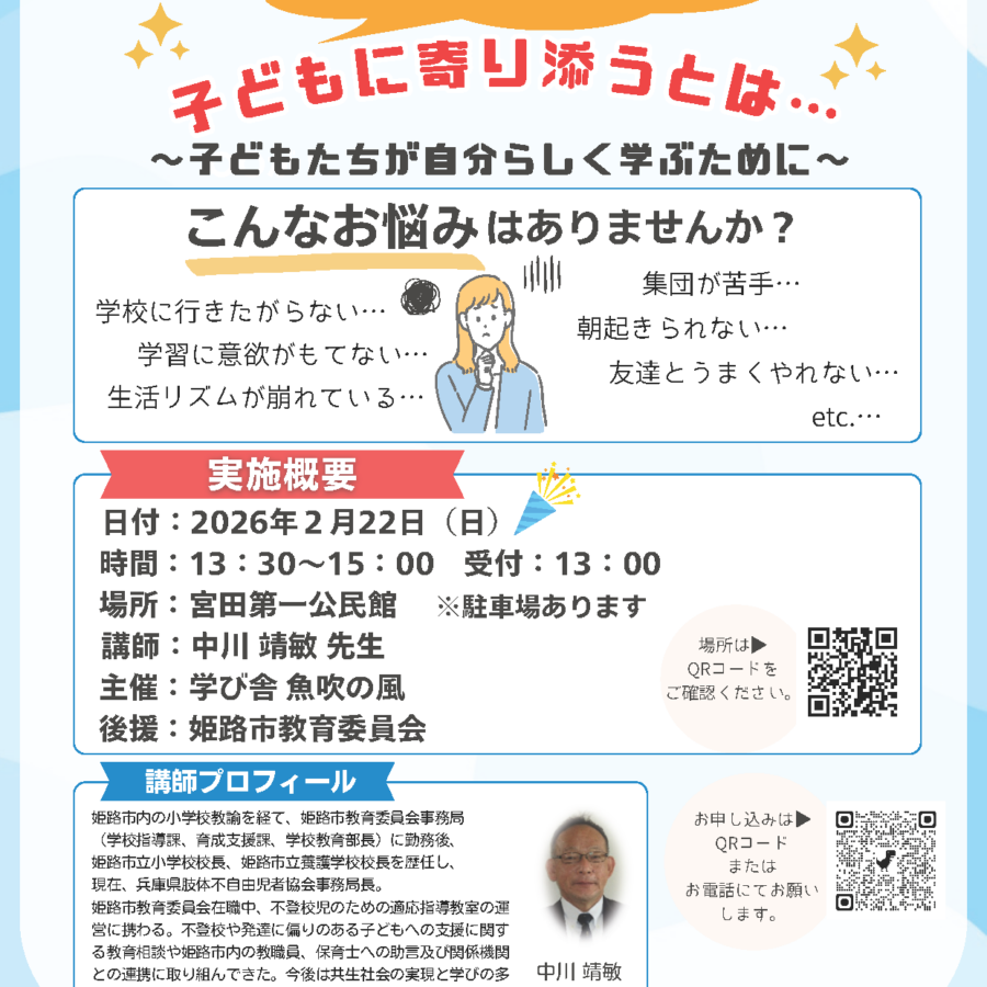 【姫路市勝原区】子育てや不登校の悩みにヒントを。2/22(日)保護者向け教育講演会が開催されます こんにちは、姫路スパイス編集部...
