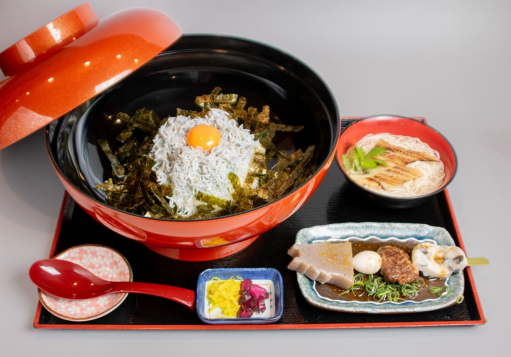 黒田官兵衛の赤い兜をイメージした「大名椀」に盛り付けた名物シラス丼をはじめ、