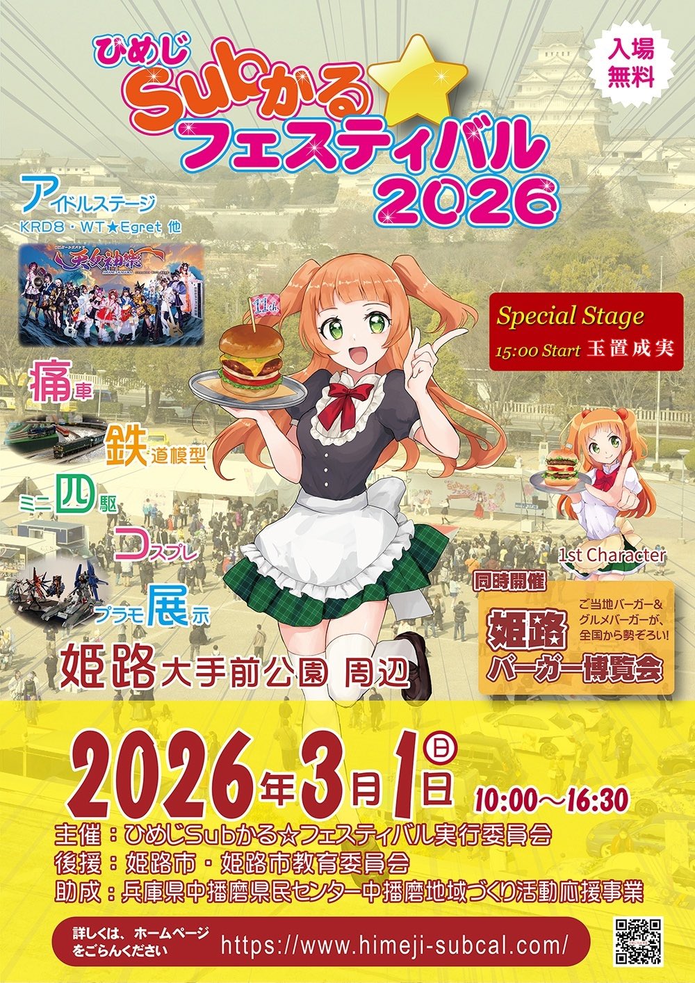 2026年3月1日(日)、兵庫県姫路市の大手前公園および周辺一帯で、サブカルチャー好きのための一大イベント「ひめじSubかる☆フェスティバル2026」が開催されます。幅広いジャンルのコンテンツが詰まった楽しい一日を過ごせるイベントです。