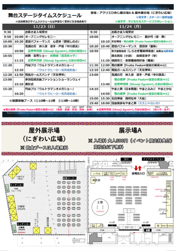 | 入場料 | 大人 500円(イベント限定特典付) 高校生以下 無料 ※飲食ブース(屋外)は入場無料 |
