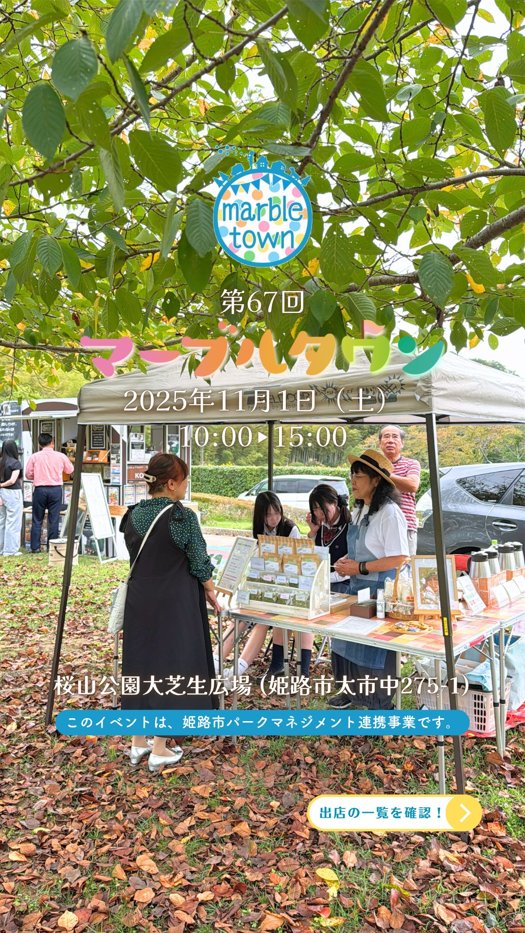 2025年11月1日(土)、姫路市の「桜山公園 大芝生広場」にて、毎回大人気のマルシェイベント「第67回 マーブルタウン」が開催されます!
