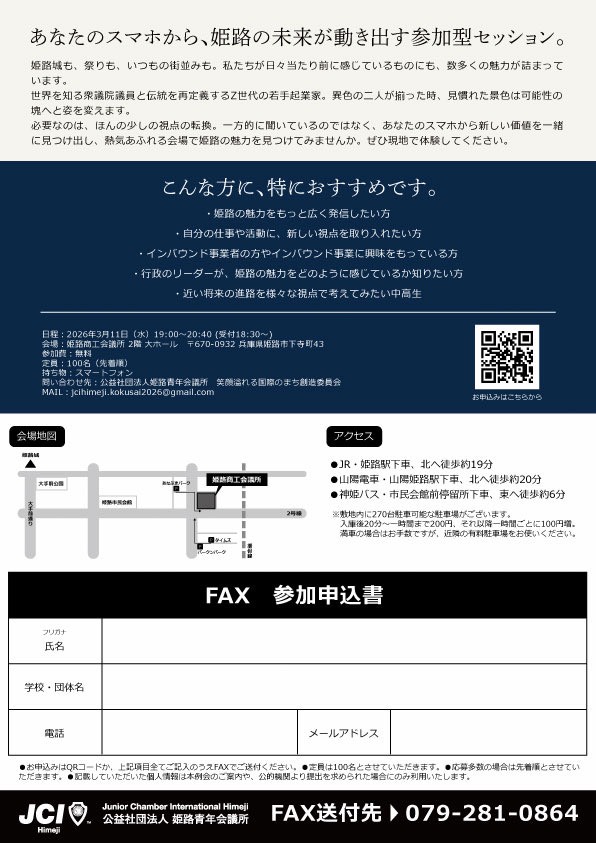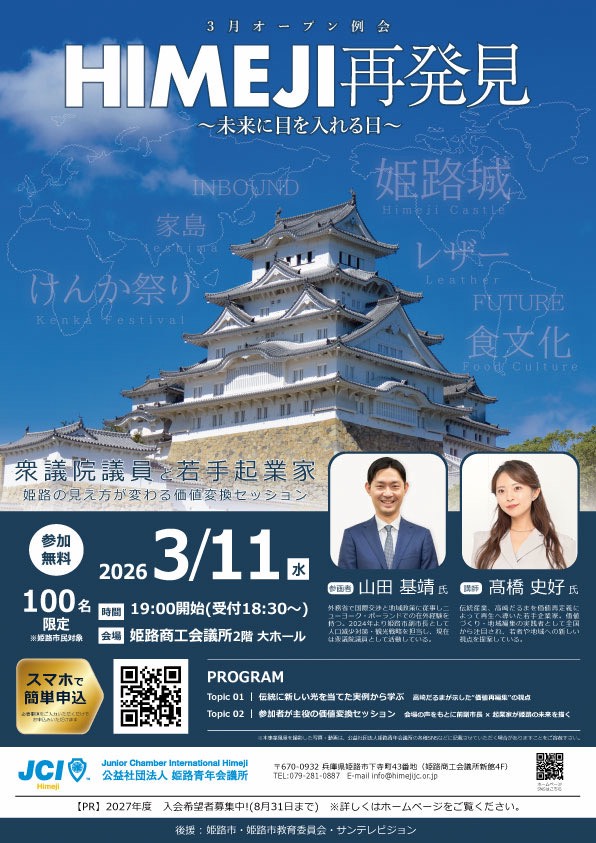 今回は、そんな視点の転換を体験できる、非常に興味深いイベント情報を見つけました。3月11日に開催される、公益社団法人姫路青年会議所(JCI姫路)主催のオープン例会です。テーマは「HIMEJI再発見!!~未来に目を入れる日~」。