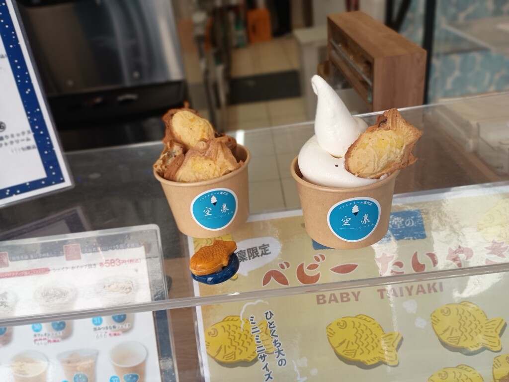 絶品鯛焼きと冷た〜いソフトクリームの最強コンボを楽しめるのは今だけ。いそげ〜!