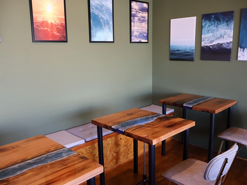店内は約18坪の広さで、16席の室内スペースと8席のペット同伴可能なテラス席を設置。内装には砂浜と海をイメージしたオーダーメードのレジンテーブルが配置され、訪れる人々に非日常的な癒しの時間を提供しています。