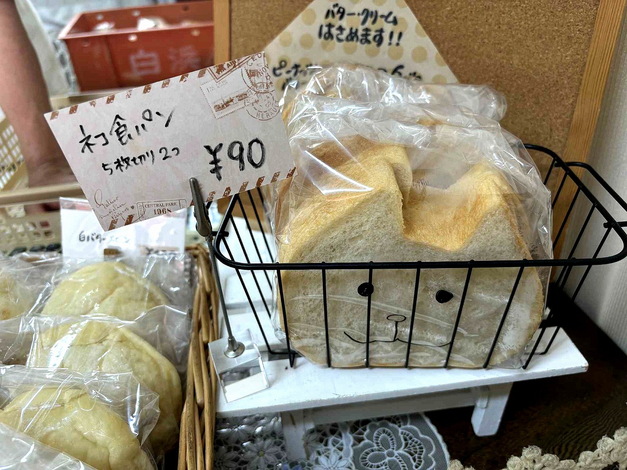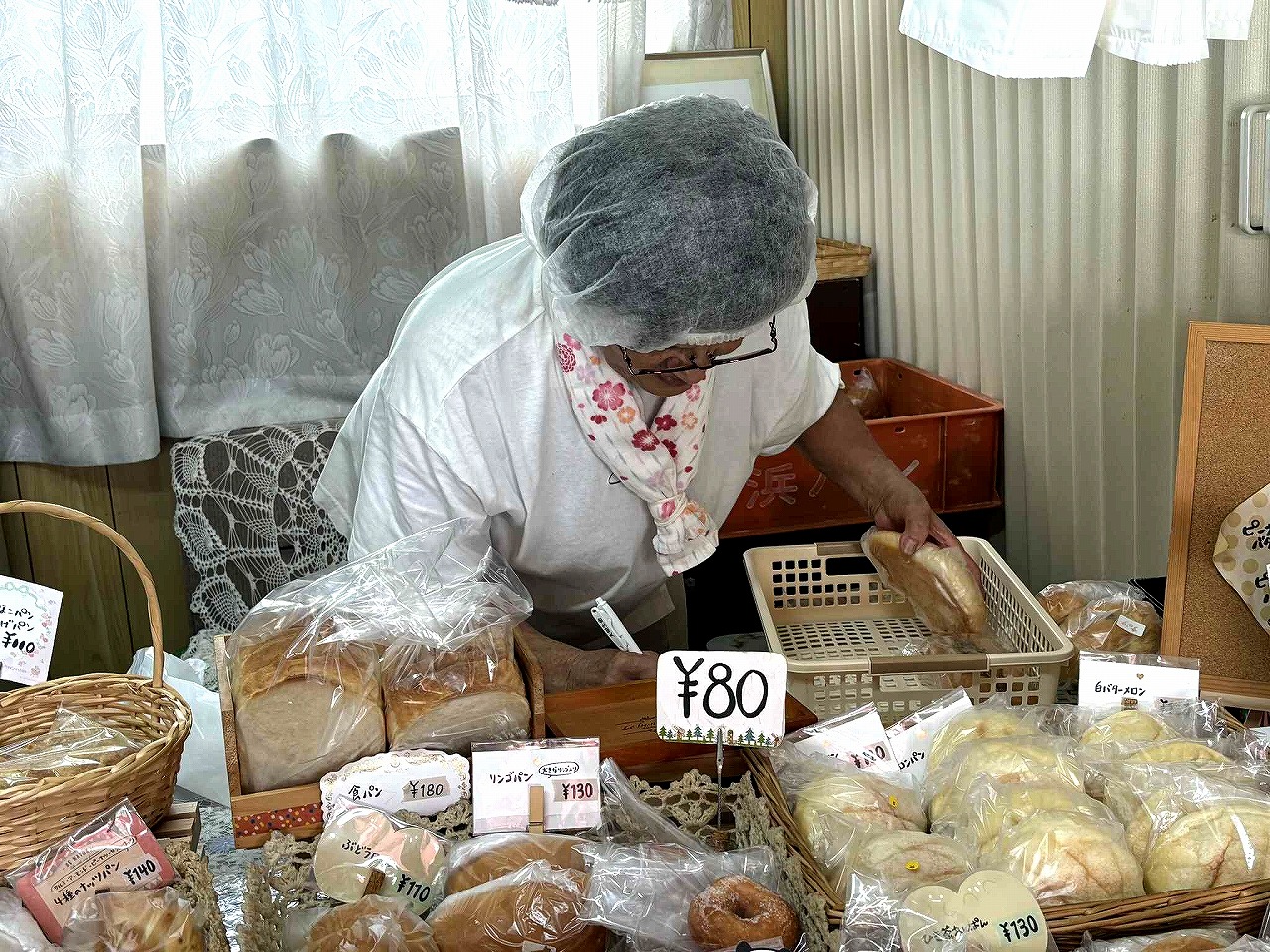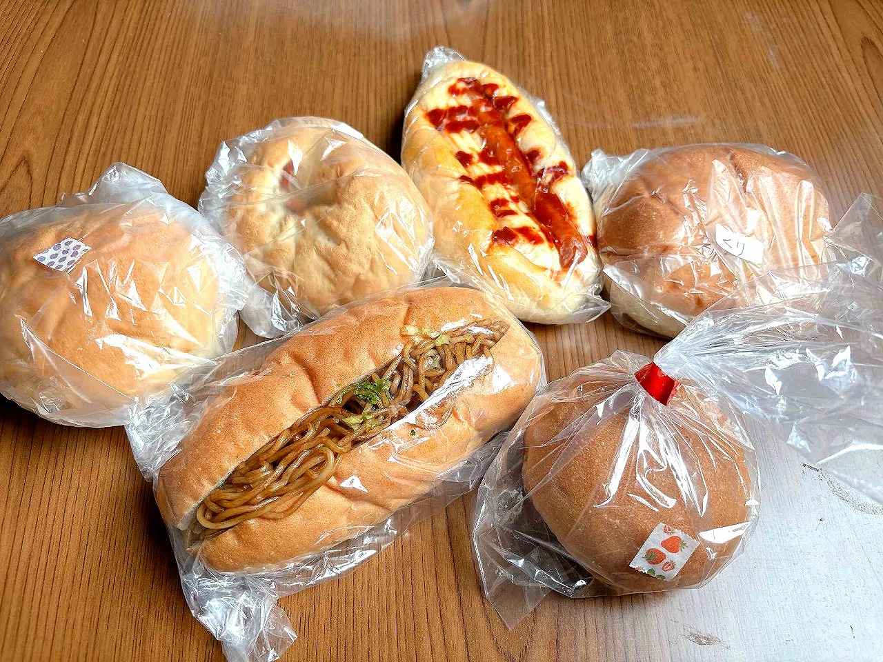 ラインナップは、小さいいちごジャムパン(70円)、焼きそばパン(150円)、ソーセージパン、クリームパン、ノンフライカレーパン(以上130円)、食パン(180円)など。20種類以上が所狭しと並べられ、ひとつずつ包装され、価格は驚くほど良心的です。この日、菓子パンを6つ、購入しても730円というお手頃さでした。